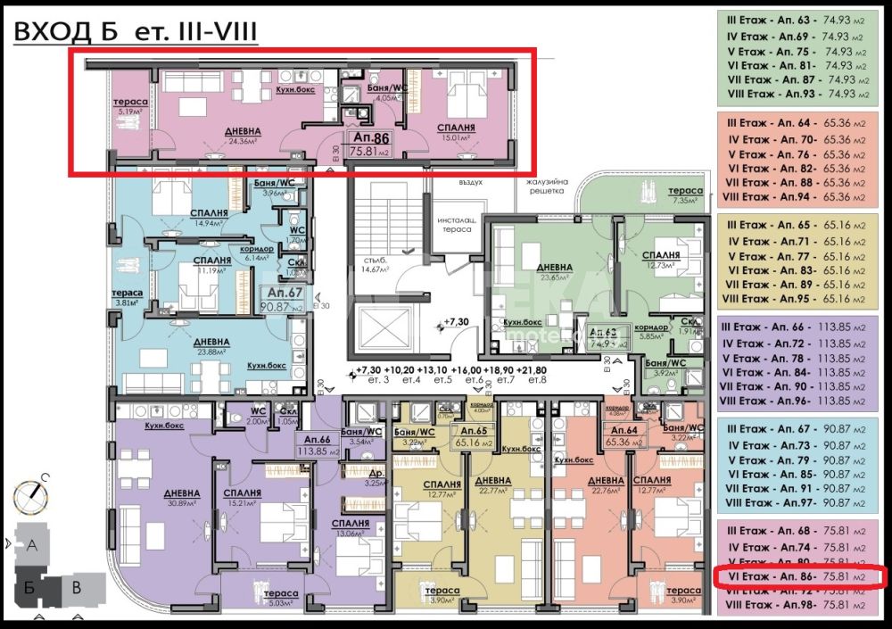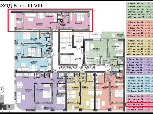 Двустаен апартамент с площ 75,81 кв. м., етаж 6 от 10, асансьор.