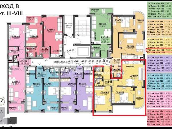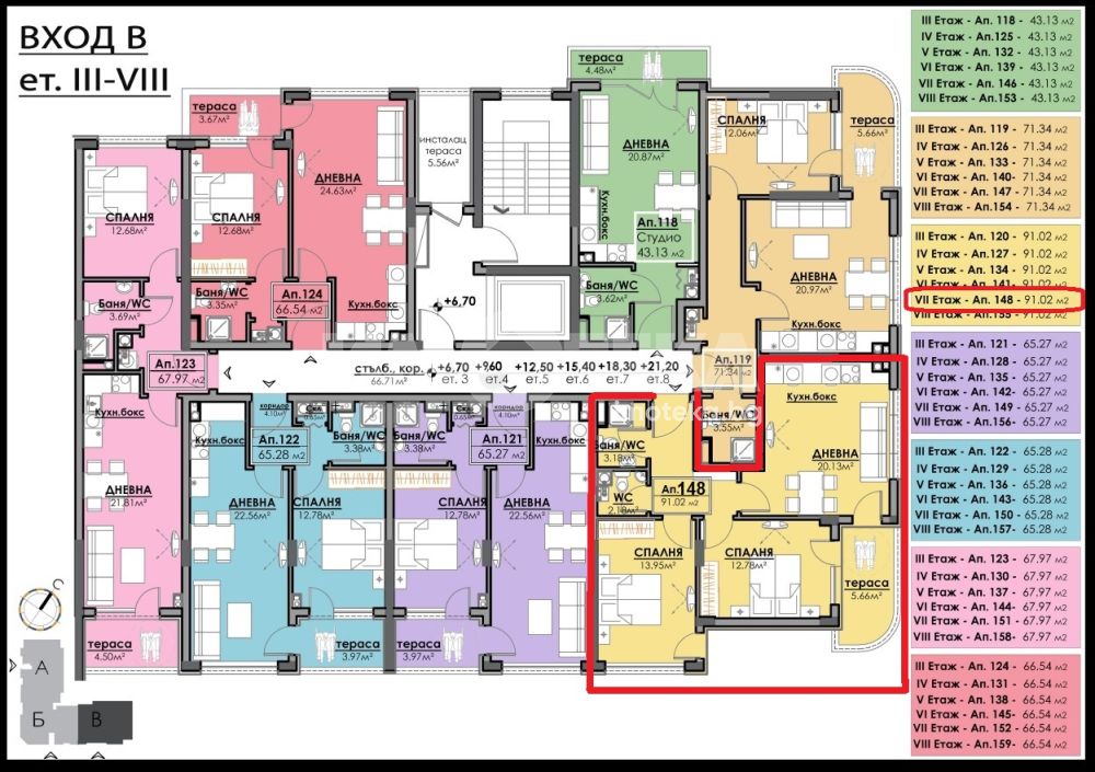 Тристаен апартамент с площ 91,02 кв. м., етаж 7 от 10, асансьор.