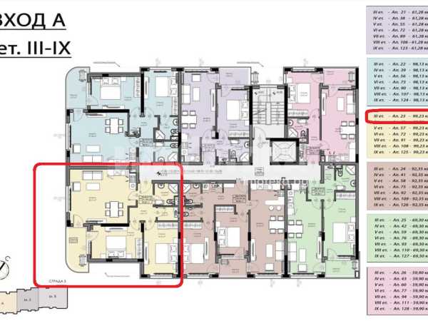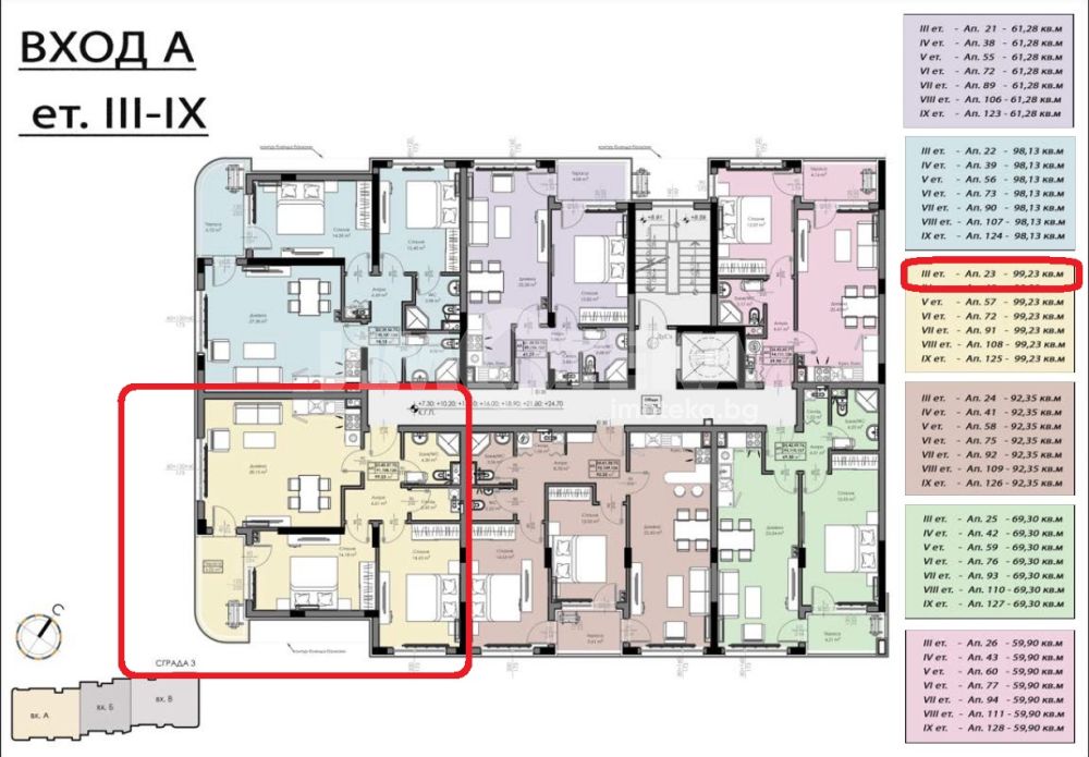 Площ на имота 99,23 кв. м., етаж 3 от 10, асансьор. Завъшва се до степен ТАПА.