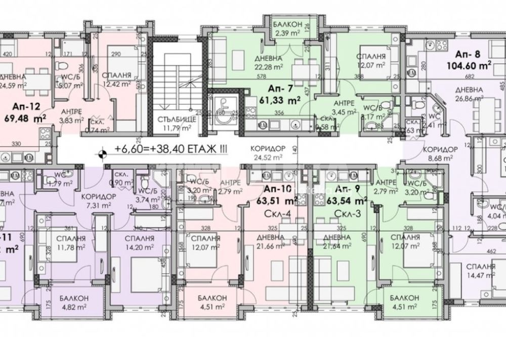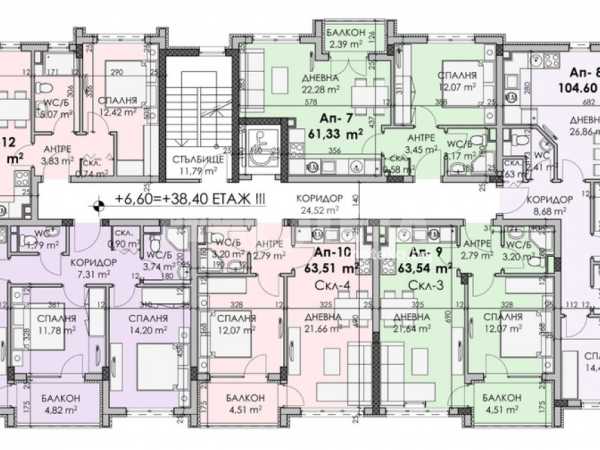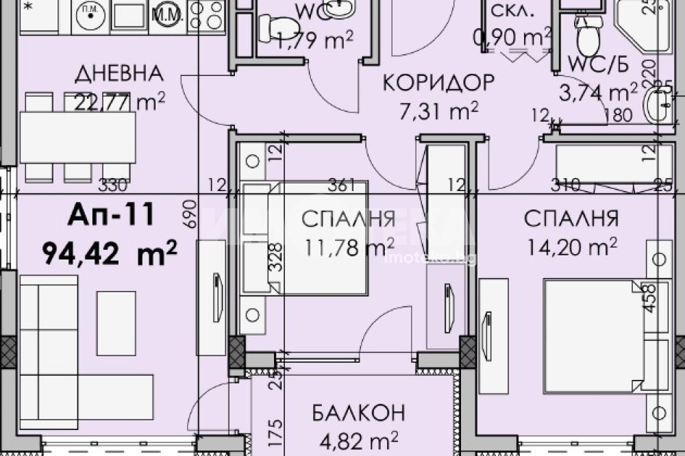 Площ на имота 94,42 кв. м., етаж 3 от 7, асансьор. Разпределение: дневна с кухненски кът и спалня с общ балкон, спалня, две бани с тоалетни и складово помещение.