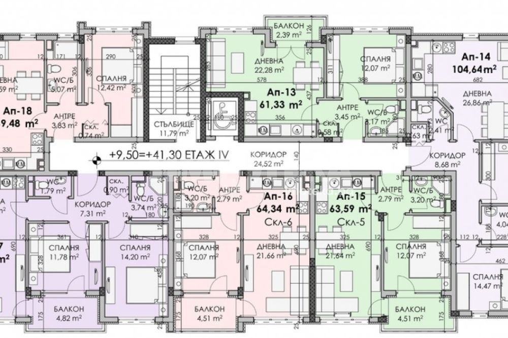 Площ на имота 95,90 кв. м., етаж 4 от 7, асансьор. Разпределение: дневна с кухненски кът и спалня с общ балкон, спалня, две бани с тоалетни и складово помещение.
