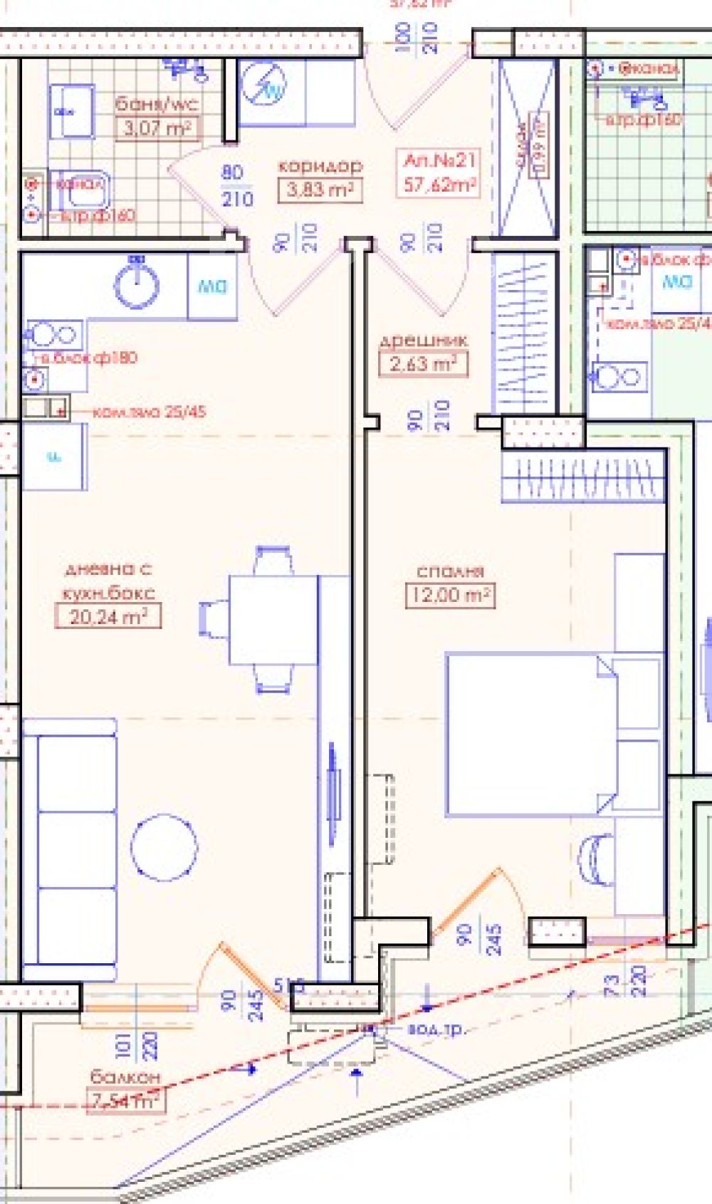 Двустаен апартамент в Жилищна сграда „Хоризонт“ с гъвкави схеми на плащане с възможност за разсрочване. С площ от 66.21 кв.м. на етаж 3. Състои се от дневна с кухня, спалня, баня с WC, коридор и тераса.