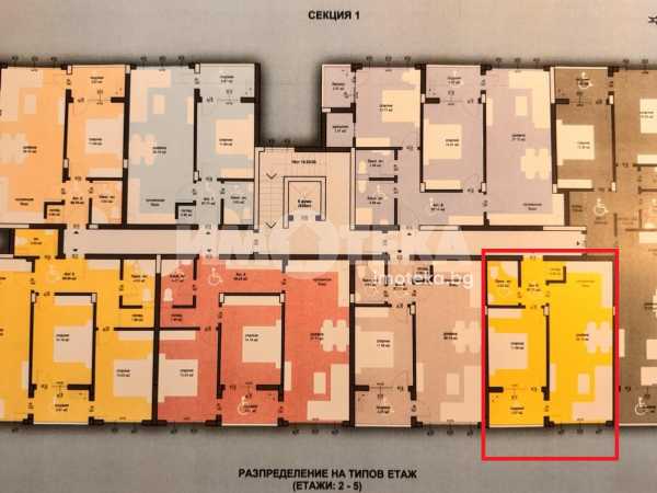 Площ на имота 65,321кв. м., етаж 5 от 5, асансьор. Състои се от антре, дневна с кухненски кът и трапезария и спалня, като от двете помещения се излиза на тераса, баня с тоалетна и складово помещение.