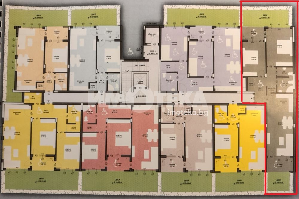 Площ на имота 107,67 кв. м. + дворно място 28,18 кв. м. или обща площ 135,85 кв. м., етаж 1 /партер/ от 5. Състои се от антре, дневна с кухненски кът и трапезария, от която се излиза в двор, две спални, като от двете помещения се излиза в двора, баня с тоалетна, тоалетна и складово помещение.