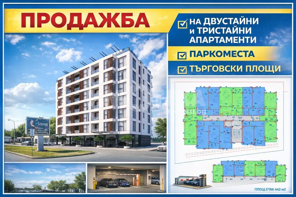 Партерен етаж – търговски помещения, включващи 2 магазина, както и 9 паркоместа, обслужващи обектите
