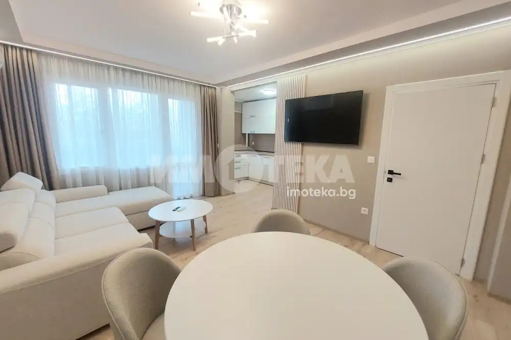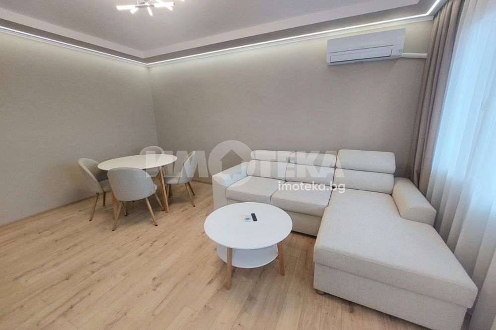 Луксозен, модерен и стилен двустаен апартамент с площ 70 кв.м. Обзаведен с много стил и вкус. Състои се от всекидневна с холна част и кухня, просторна спалня, остъклена тераса и санитарен възел. Имотът е напълно обзаведен с висококачествени мебели и уреди, елегантно декориран и много поддържан. Отоплението е на климатици. Изключително светло и функционално жилище снабдено с всичко необходимо, за да се нанесете веднага. Отдава се само дългосрочно, не се допускат домашни любимци.