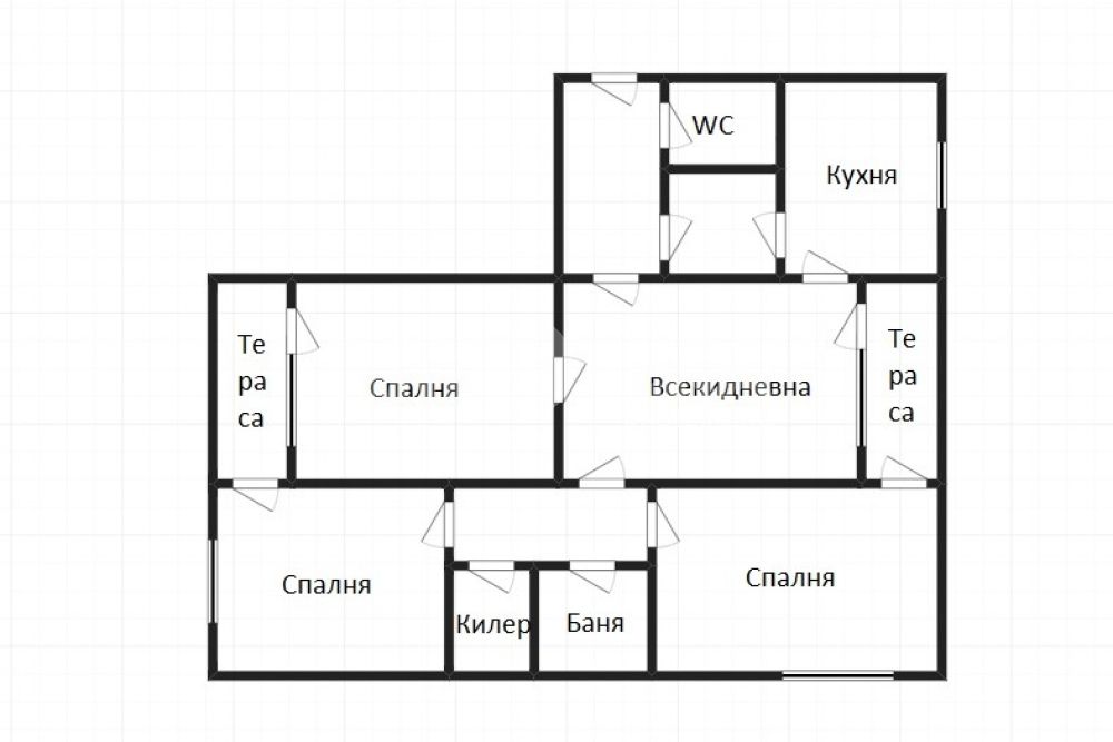 Жилището разполага с два големи коридора, три спални, голяма трапезария, отделна кухня, мокро помещение, килер, отделна тоалетна и отделна голяма баня, две големи тераси и прилежащо мазе..