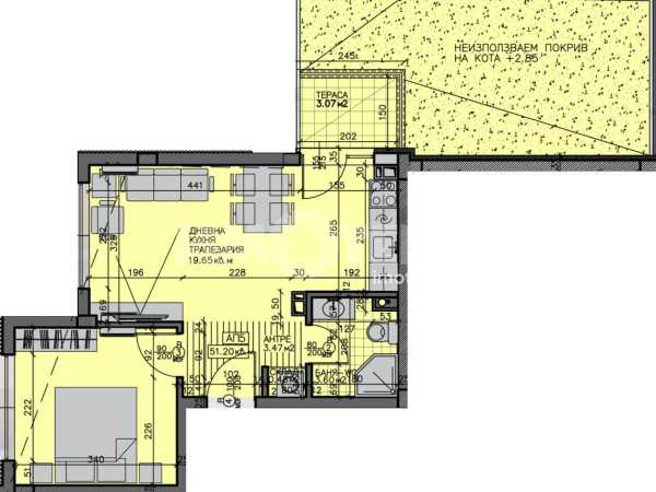 Площ на имота 86,44 кв. м., етаж 2 от 5, асансьор. Разпределение: дневна с кухненски кът с тераса, спалня, баня с тоалетна и складово помещение. Апартаментът ще бъде завършен "на тапа''.