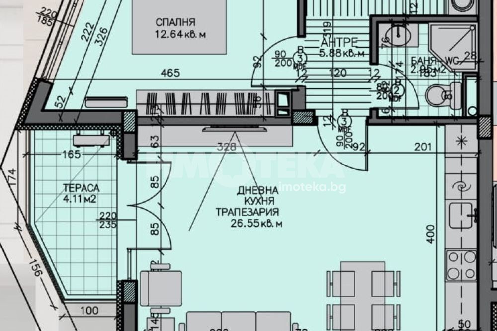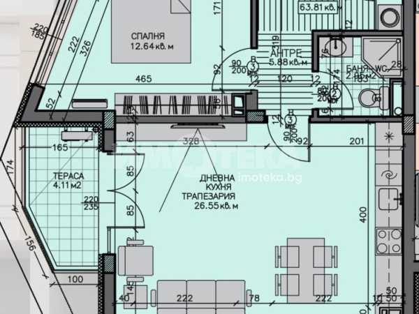 Площ на имота 76,68 кв. м., етаж 3 от 5, асансьор. Разпределение: дневна с кухненски кът с тераса, спалня, баня с тоалетна и складово помещение. Апартаментът ще бъде завършен "на тапа''.