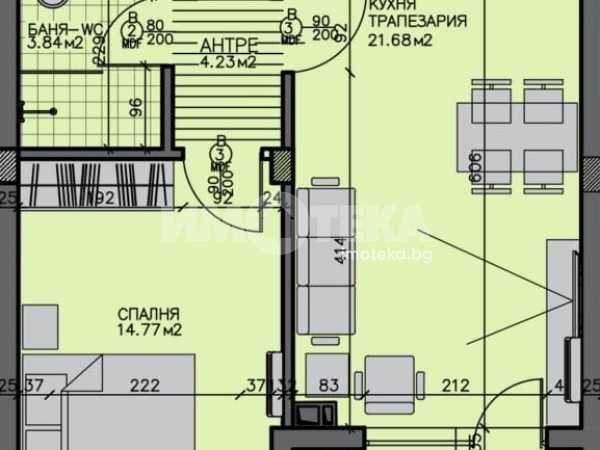Площ на имота 71,41 кв. м., етаж 4 от 5, асансьор. Разпределение: дневна с кухненски кът, спалня, тераса, баня с тоалетна и складово помещение. Апартаментът ще бъде завършен "на тапа''.