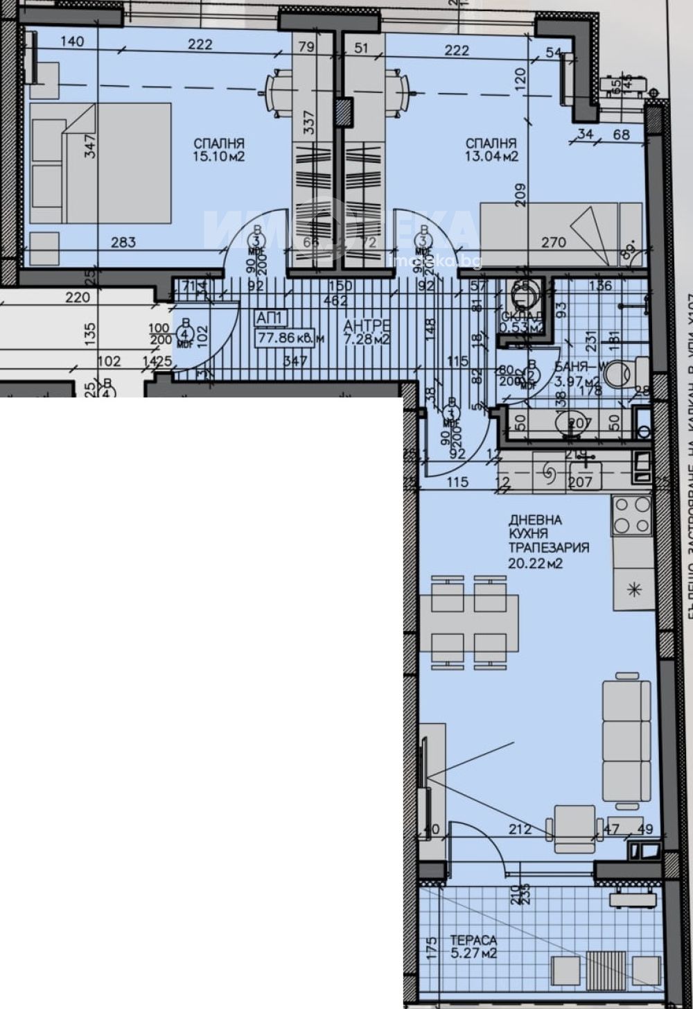 Тухлен апартамент с площ 94.28 кв.м. и се състои от дневна с трапезария и кухня ,две спални ,баня с тоалетна,коридор и тераса .