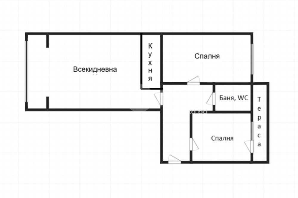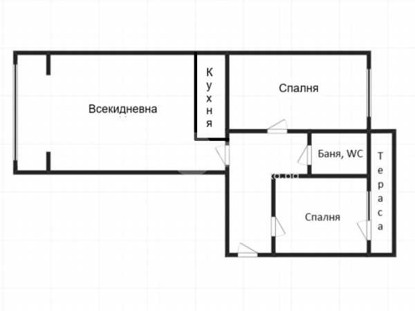 Просторна дневна с трапезария и кухненски бокс, две непреходни спални, баня с WC и тераса.