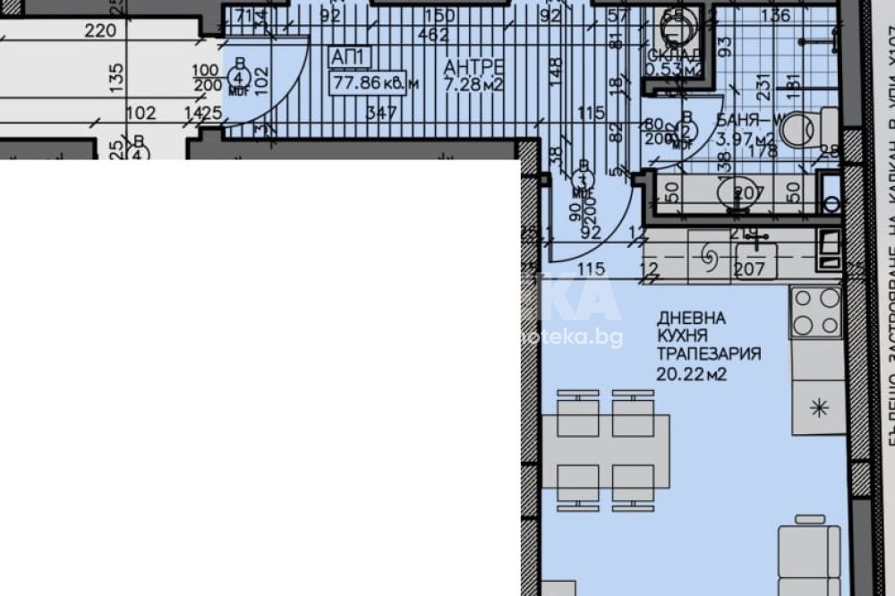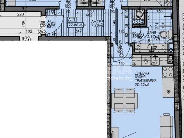 Площ на имота 94,28 кв. м., етаж 2 от 5, асансьор. Разпределение: дневна с кухненски кът с тераса, две спални, баня с тоалетна и складово помещение. Апартаментът ще бъде завършен "на тапа''.