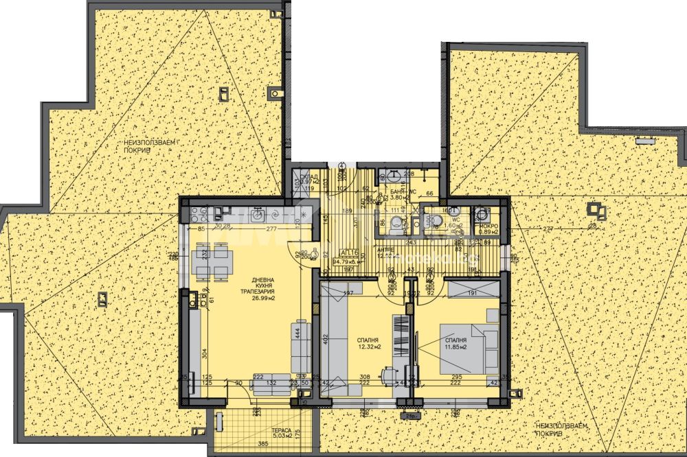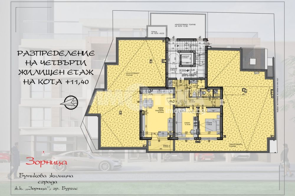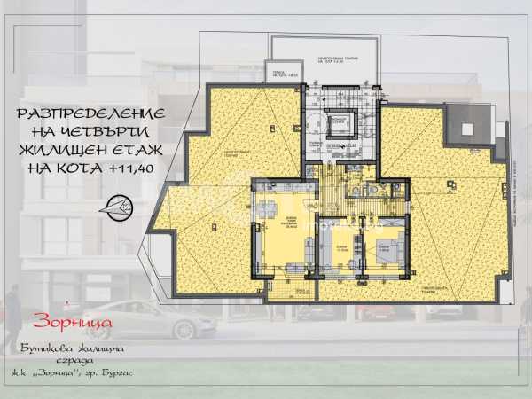 Тристаен апартамент в нова жилищна - бутикова сграда - нов стандарт на живот, кв. Зорница, гр. Бургас. Площ на имота 323,51 кв. м., етаж 5 от 5, асансьор. Разпределение: дневна с кухненски кът с тераса, две спални, баня с тоалетна, тоалетна и складово и мокро помещение. Апартаментът ще бъде завършен "на тапа''. Към всеки имот може да бъде закупено ПАРКОМЯСТО от 25 000 до 30 000 ЕВРО.