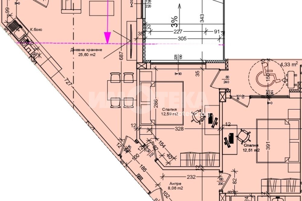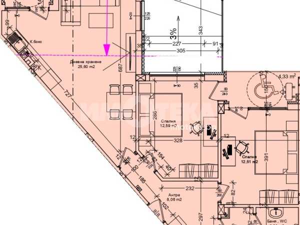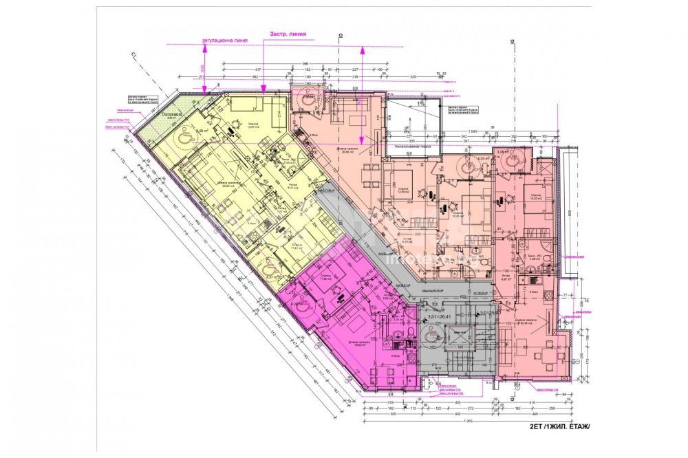 Тристаен, просторен апартамент в кв. Зорница, гр. Бургас. Акт 14. Площ на имота 114,32 кв. м., етаж 2 от 4, асансьор. Разположение: дневна с кухненски кът и трапезария с тераса, две спаллни с обща тераса, складово помещение и баня с тоалетна.