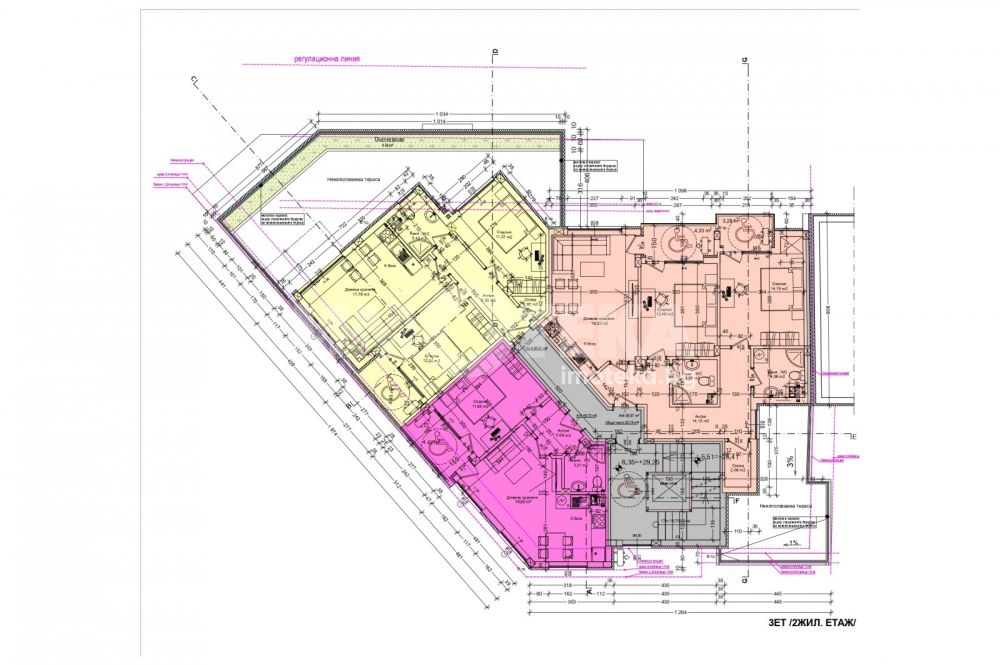 Тристаен, просторен апартамент в кв. Зорница, гр. Бургас. Акт 14. Площ на имота 134,22 кв. м., етаж 3 от 4, асансьор. Разположение: дневна с кухненски кът и трапезария, спалля с тераса, втора спалня, складово помещение и баня с тоалетна.