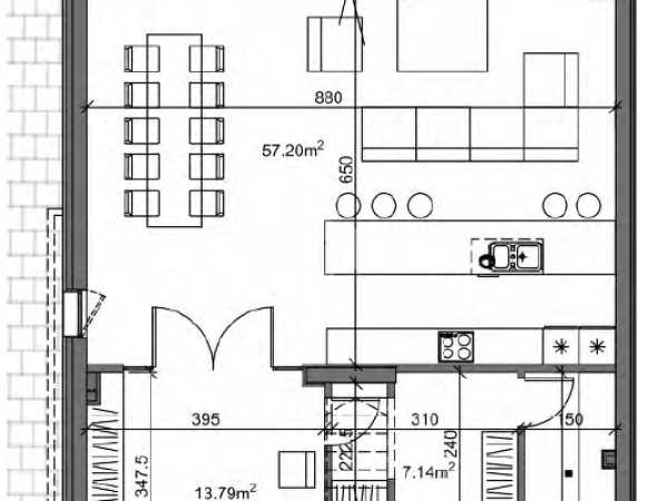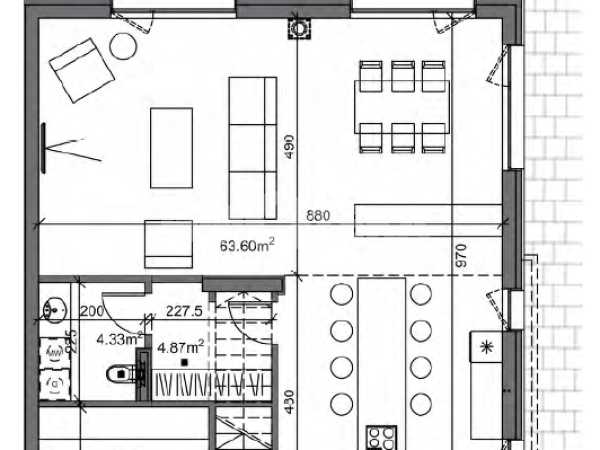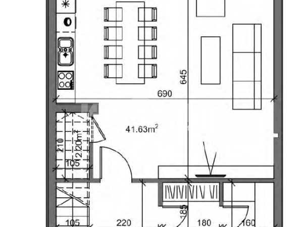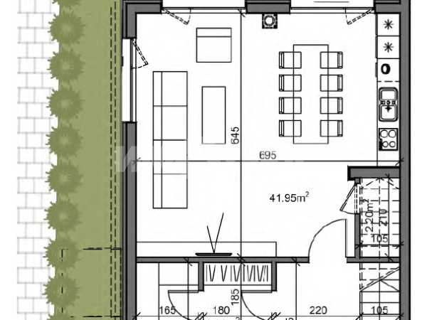 Първият етаж е с площ от 81.95 кв.м. и включва просторна дневна с кухня и трапезария /41,63 кв.м./, проектирана като светло и отворено пространство – идеално за семейни събирания и уютни вечери у дома. На етажа са разположени още санитарен възел и сервизно помещение, които допринасят за практичността на жилището.