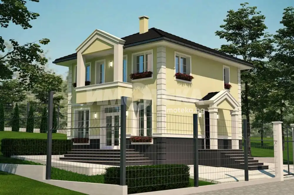 Втори етаж: Три спални (едната с гардеробна и баня), коридор, втора баня с тоалетна, балкон.