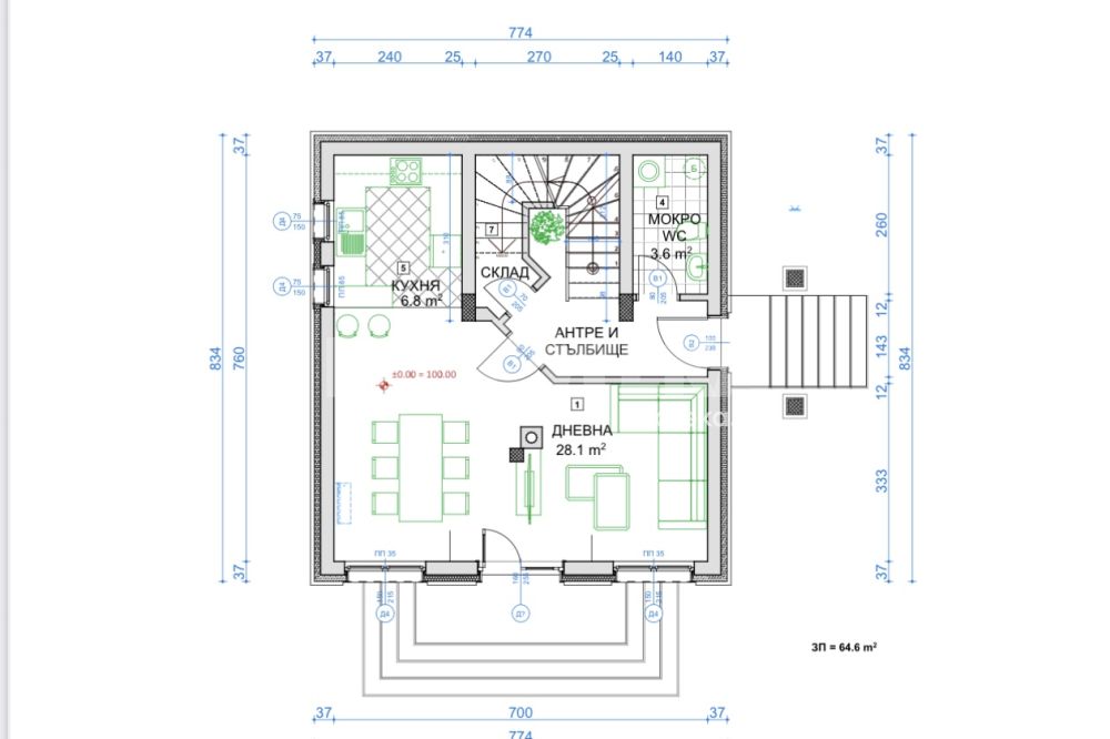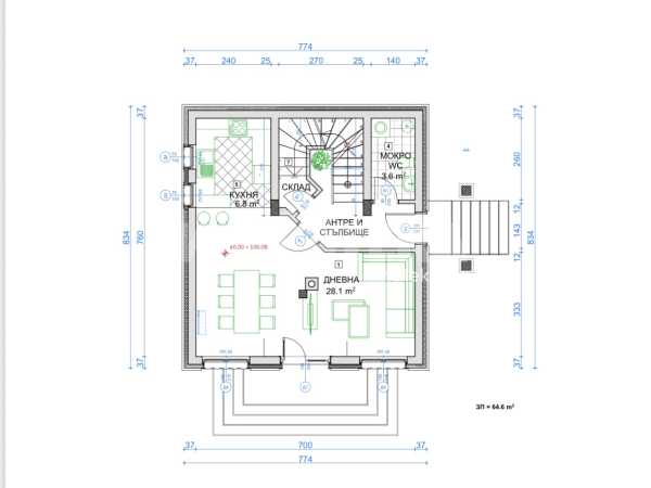 Етаж 1 (67.7 кв.м): Входно антре, практичен склад, баня с тоалетна и просторна дневна с кухня и трапезария.