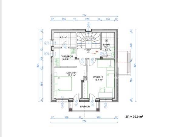 Етаж 2 (70 кв.м): Коридор, две уютни спални (едната със собствена баня, тоалетна и гардеробна), втора баня с тоалетна и балкон.