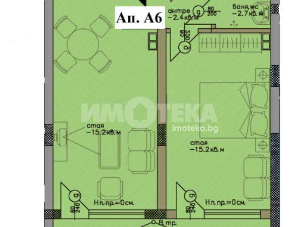 Имота се състои от: входно антре, хол с кухненски бокс, спалня, баня с тоалетна и тераса. Към апартамента има и склад с 2.34 кв.м.