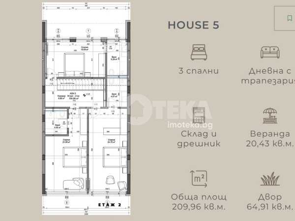етаж 2 - три спални, всяка със санитарен взел. В двора може да бъде изграден (по желание на клиента) басейн 15 кв. м.