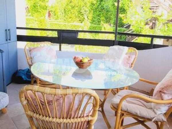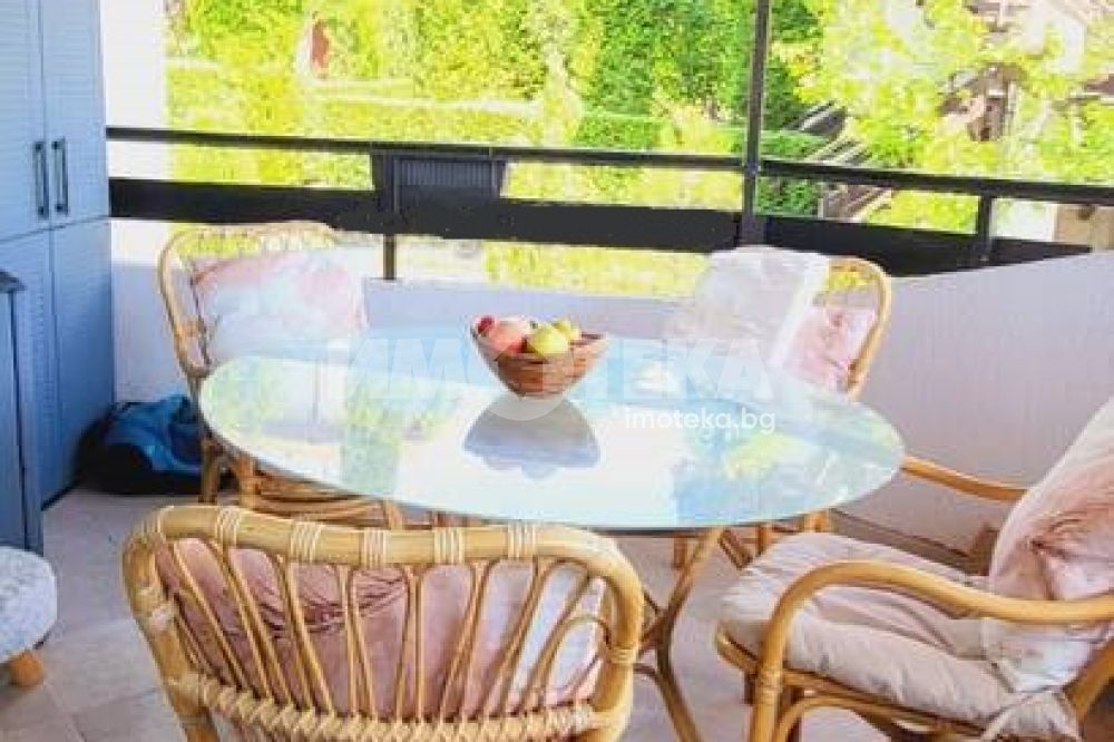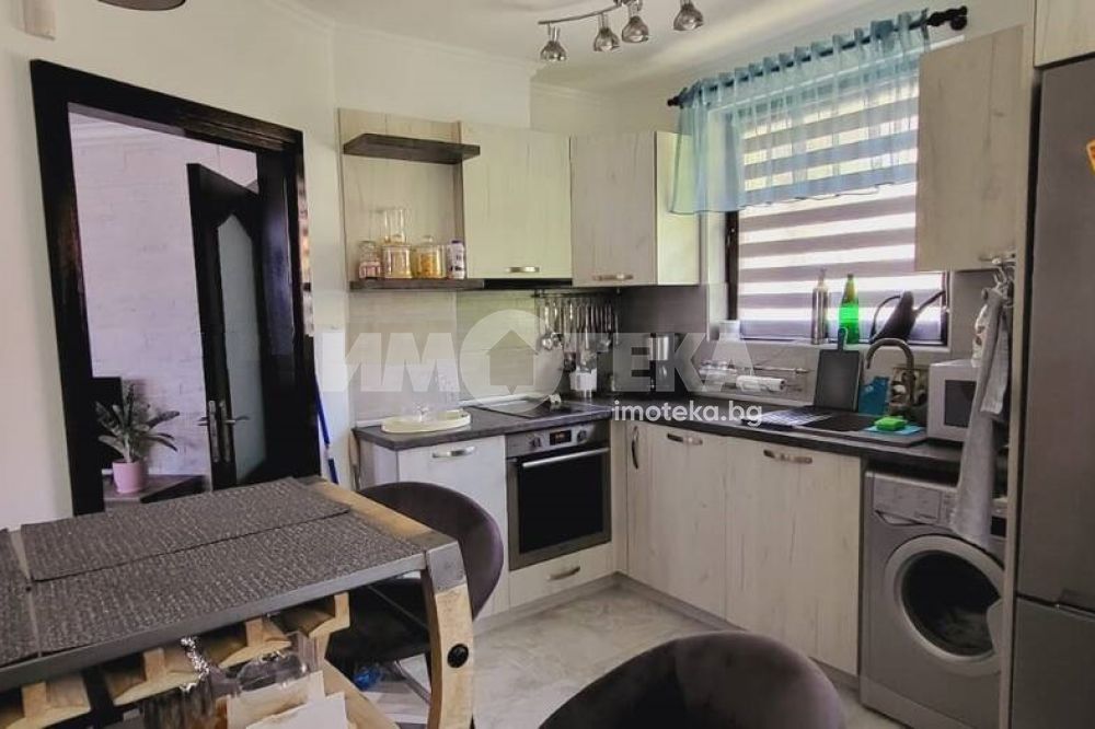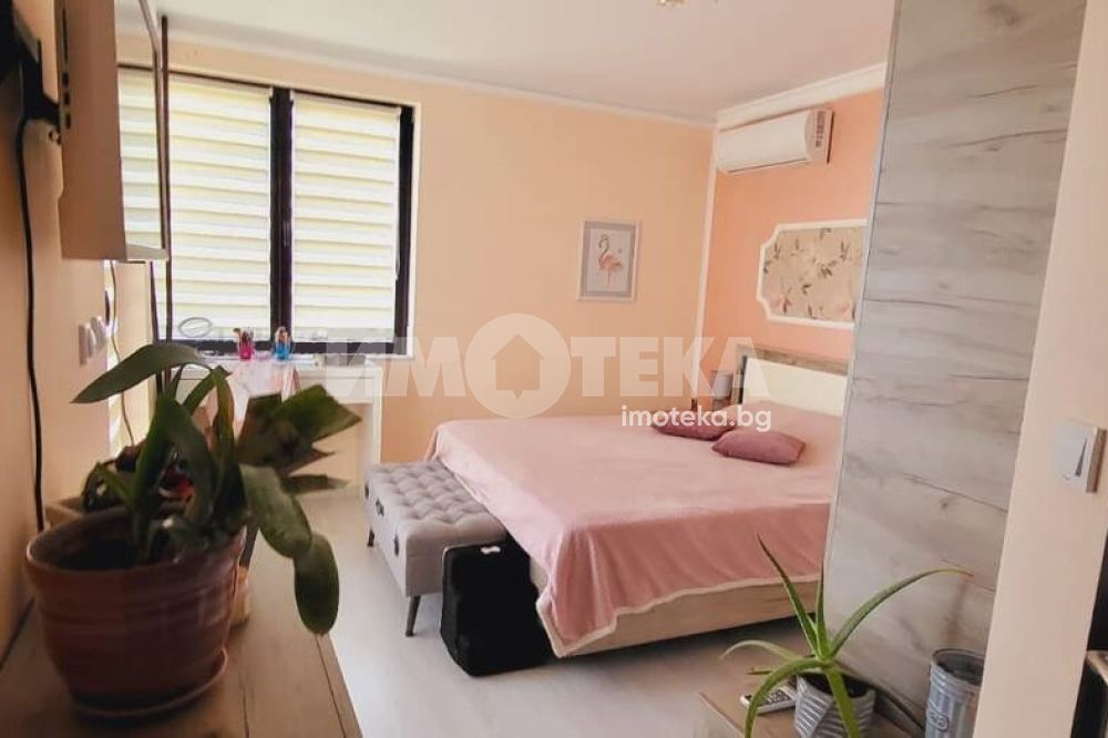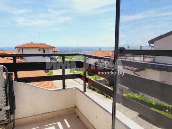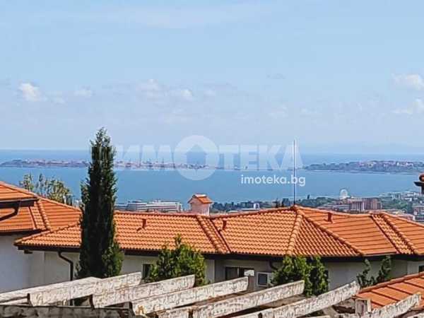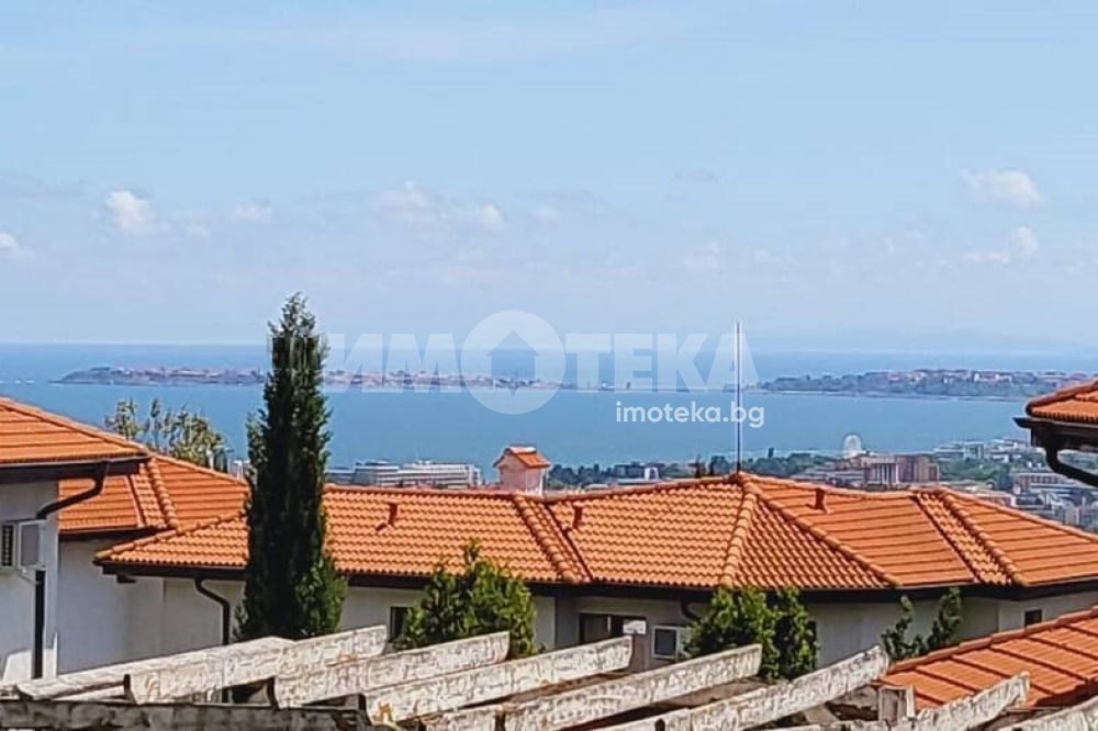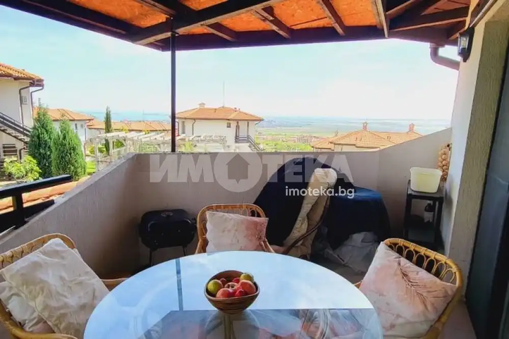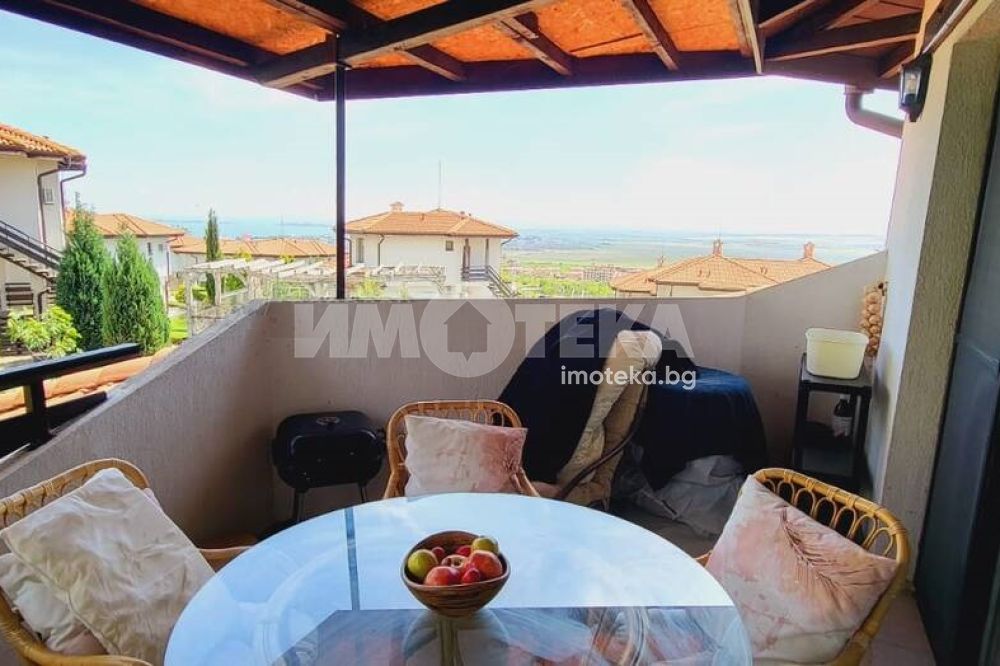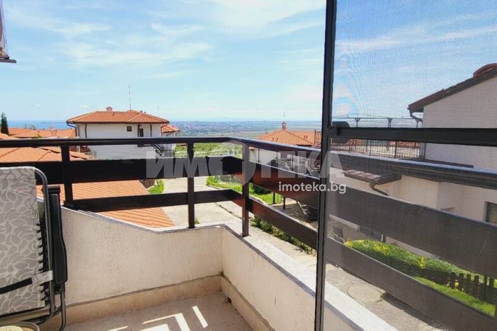 Къща с южно изложение в комплекс с три басейна, фитнес център, бар басеин, ресторант, магазин. Състои се от хол с голяма тераса с прекрасна морска гледка, голяма кухня с кът за хранене, спалня с балкон с вид на море, отделно тоалетна и баня и помещение годно за кабинет или гардеробна или за преспиване на гости. Кухнята напълно оборудвана: голям хладилник, котлони, фурна, съдомиялна, пералня. Спалня с голям гардероб, Хол с диван и електрическа камина. Два климатика и камина перфектно се справят през зимния сезон. Всичко е в идеално състояние и е готово за нанасяне веднага както и за отдаване под наем целогодишно и/или сезонно.