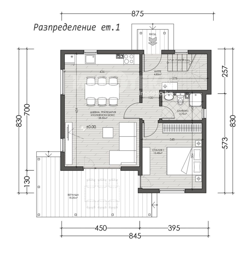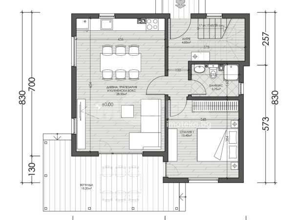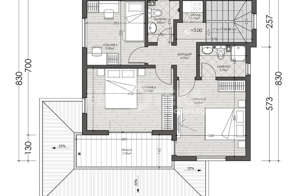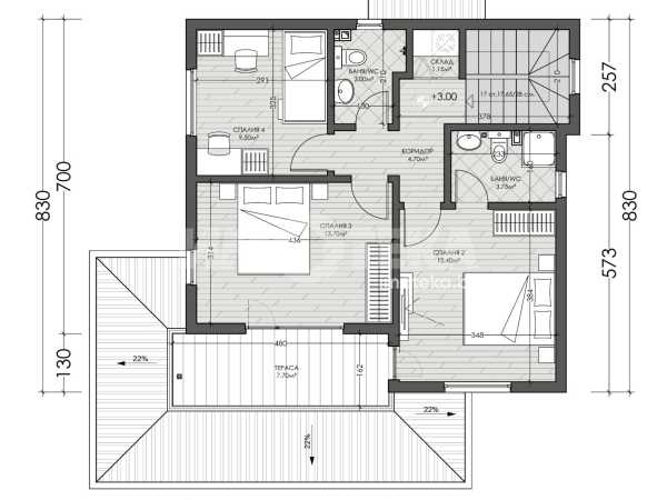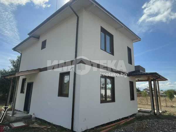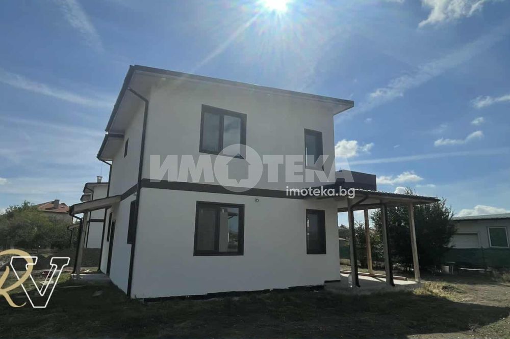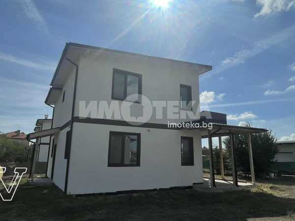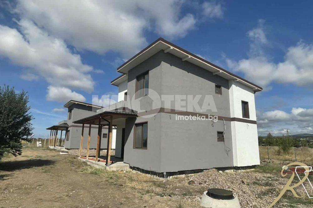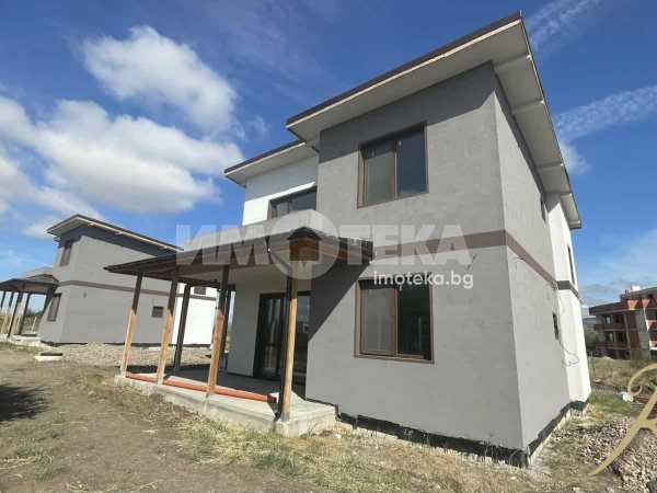 Разпределение: четири спални, три бани, дневна с кухненски бокс и трапезария, складови помещения, веранда, паркоместа