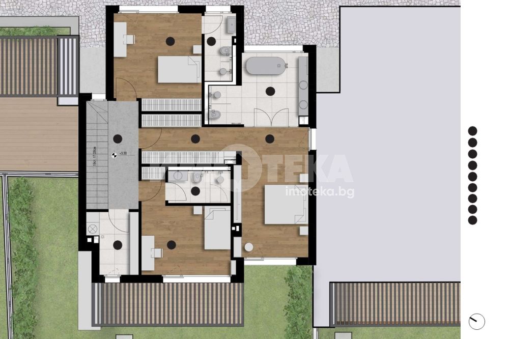 На втори етаж са разположени голяма родителска стая с дрешник и баня, две просторни детски стаи всяка с бани и перално помещение.