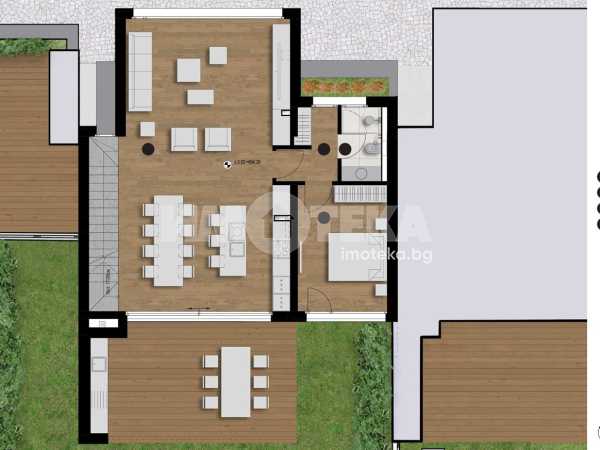 На първи етаж е разположена голяма дневна с кухненски бокс и трапезария с излаз към покрита веранда, стая за гости и баня.