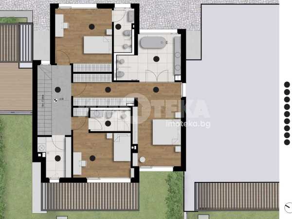 На втори етаж са разположени голяма родителска стая с дрешник и баня, две просторни детски стаи всяка с бани и перално помещение.