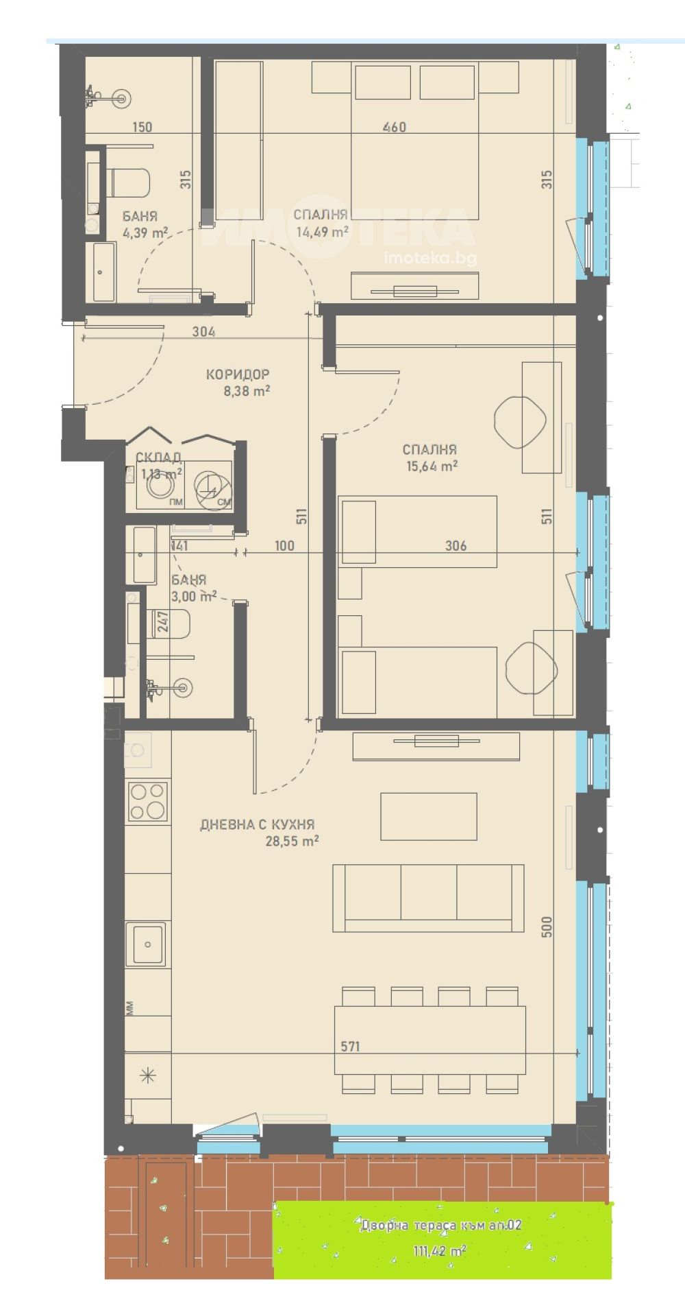 Прекрасен тристаен апартамент с голям собствен двор от 116,87м2. Жилището е със ЗП-87,04м2 и разпределение: антре, дневна с кухненски бокс и трапезария, две спални, две бани с тоалетни, склад, веранда и двор. Отоплението е предвидено на газ и климатици. Жилищата се издават на шпакловка и замазка с монтирана входна врата. Налични външни ПМ на цена от 19500 евро.