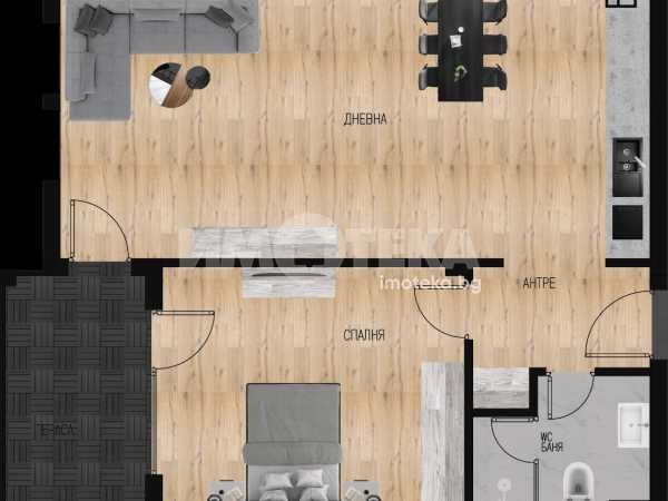 Просторен и слънчев двустаен апартамент с площ 91.81 кв .м и се състои от дневна с трапезария и кухня ,спалня ,баня+ WC ,коридор и тераса с невероятна морска панорама .