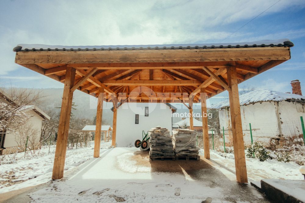 На разположение е обособена барбекю зона под масивен дървен навес с комин, подходяща за готвене и събирания с приятели. Имотът разполага още с покрит навес за автомобили и допълнителни външни складови помещения.