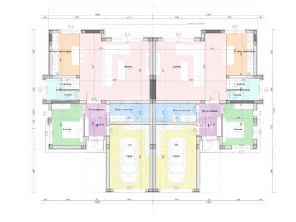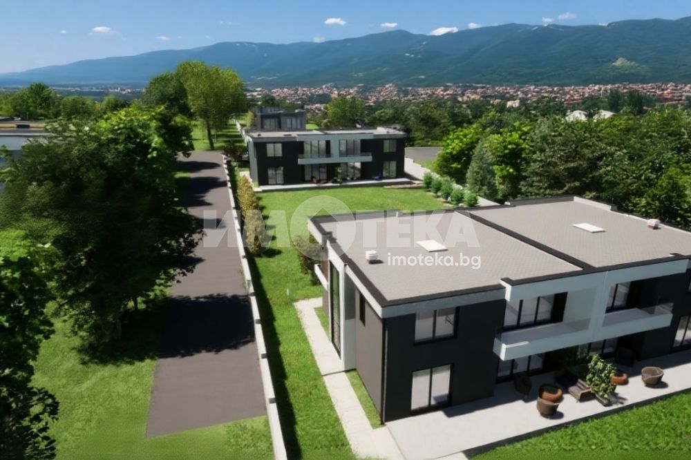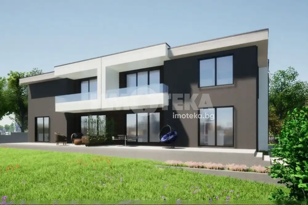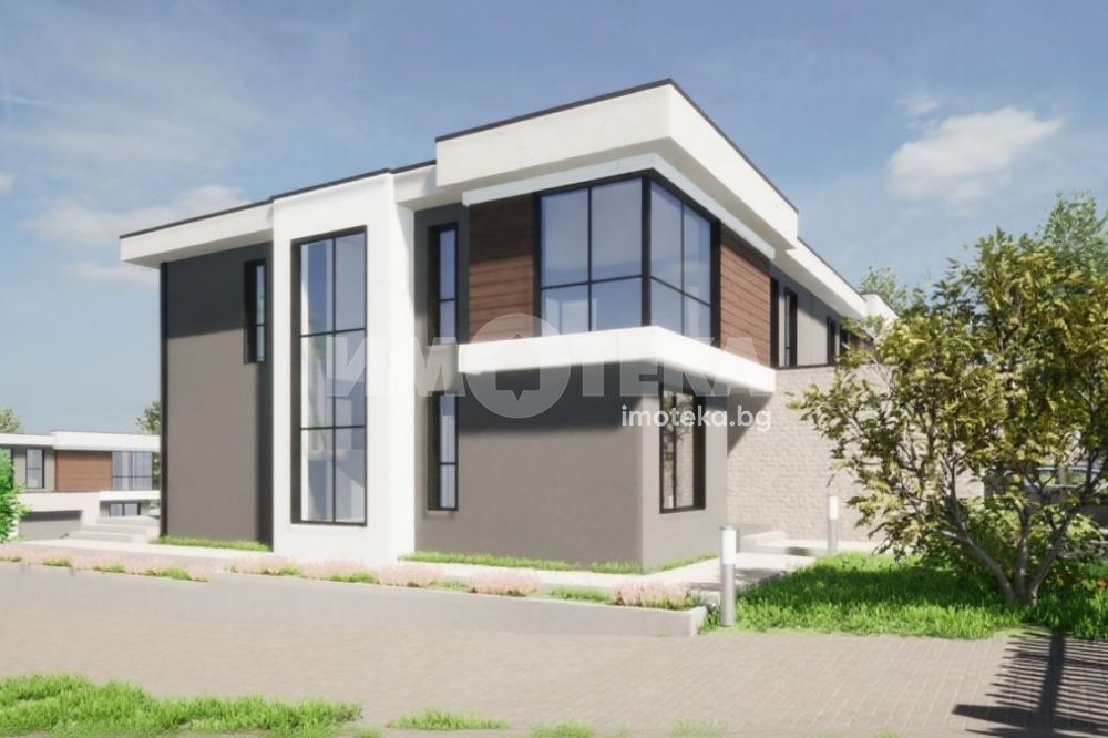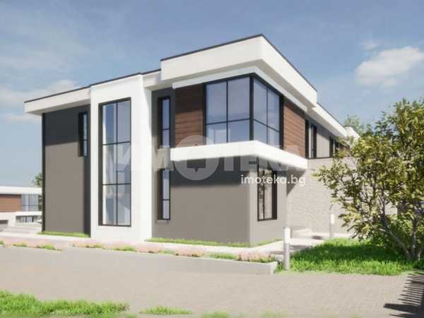 Представяме на Вашето внимание двуетажна къща с РЗП 242 кв.м. в общ имот - комплекс от четири къщи близнаци, с двор по 500 кв.м. на къща и общ обслужващ път. Имотите се състоят от: първо ниво - хол с трапезария и кухненски кът, спалня, баня с тоалетна и гараж с топла връзка;