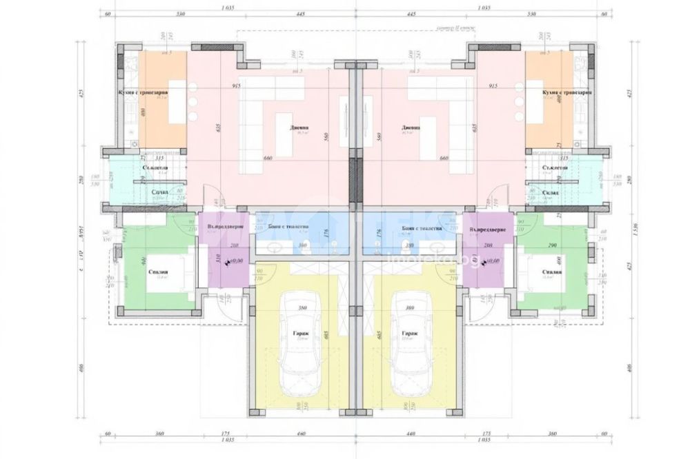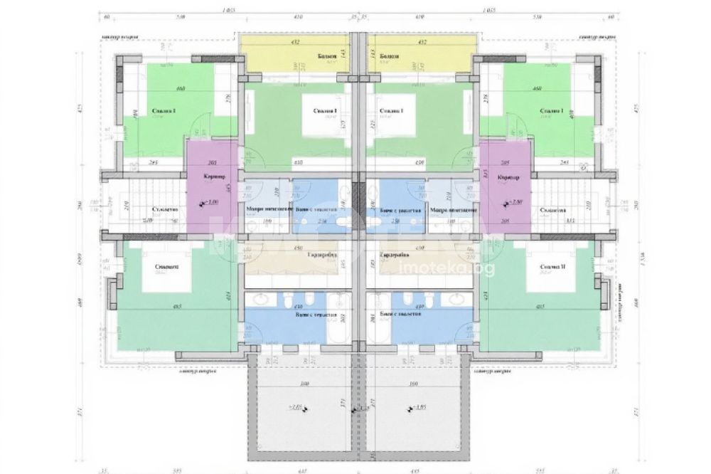 второ ниво - три спални, едната от които има баня с тоалетна и още една баня с тоалетна обслужваща другите две спални на етажа, гардеробна и мокро помещение. Жилищата ще бъдат издадени на: стени и тавани - гипсова мазилка, под - циментова замазка, дограма - PVC с троен стъклопакет, луксозна фасада, ВИК - на тапа, ел. инсталации - до ключ, инсталация за парно и подово отопление;