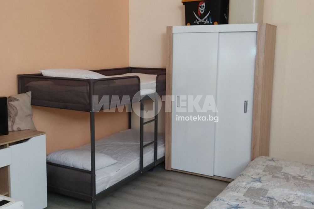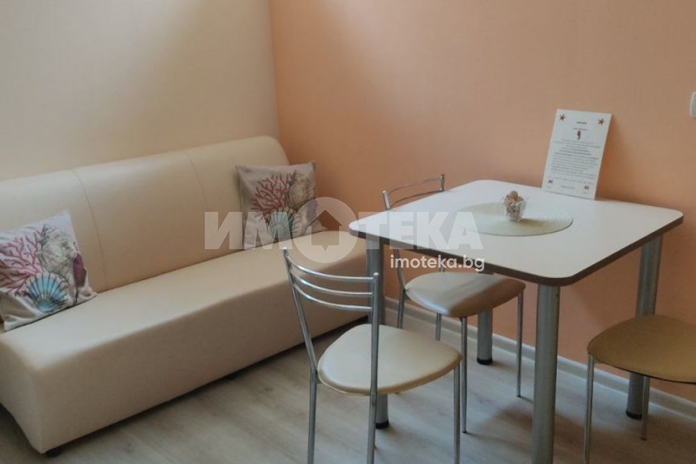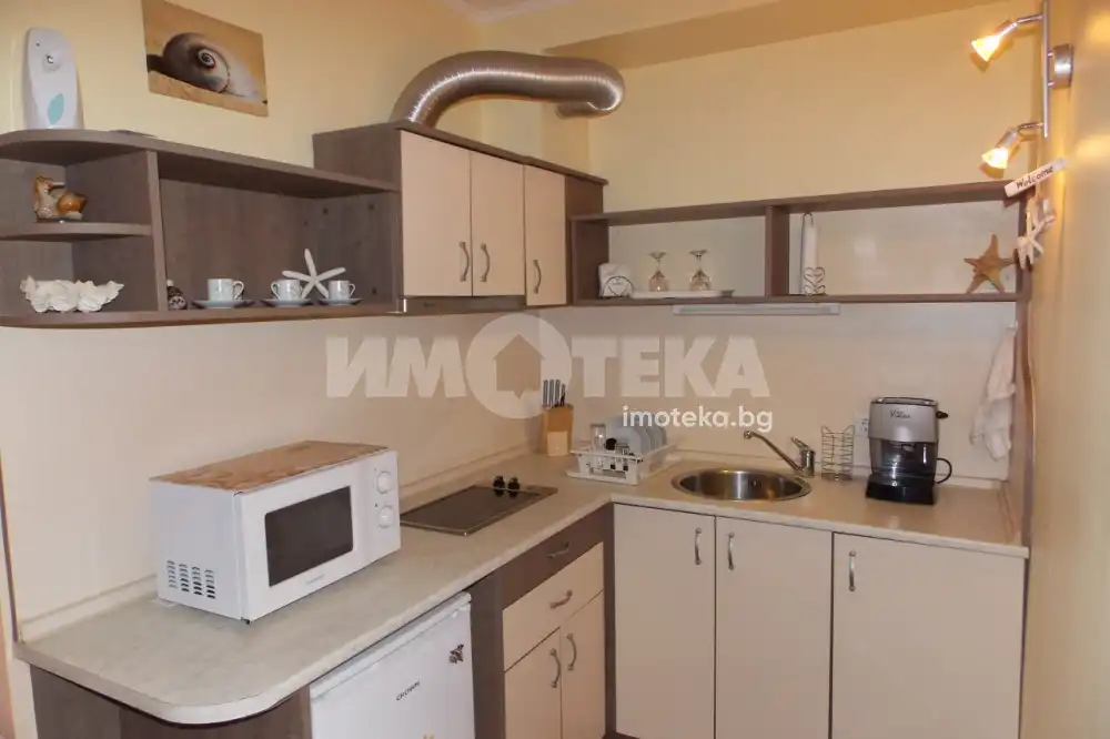 Първа линия море - само на 50 м от Южен плаж - Несебър. Едностаен апартамент (студио) с площ 46.87 кв. м. Състои се от антре, килер, баня с тоалетна, голяма дневна с кухненски бокс, кът за хранене, спалня и голямо двуетажно детско легло. НАПЪЛНО ОБЗАВЕДЕН. Продава се с всички електроуреди (готов за живеене, отдаване под наем). Студиото е перфектно за летен семеен ваканционен имот. Комплексът е от затворен тип със собствен басейн и паркинг, контролиран достъп, Wi Fi, видеонаблюдение, озеленени общи части, ресторант. Годишна такса поддръжка 350 евро.