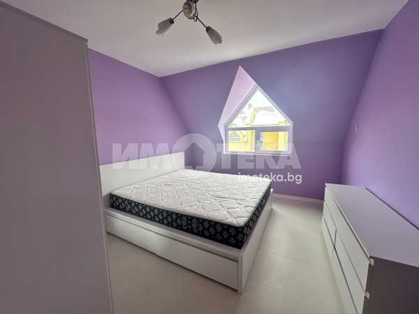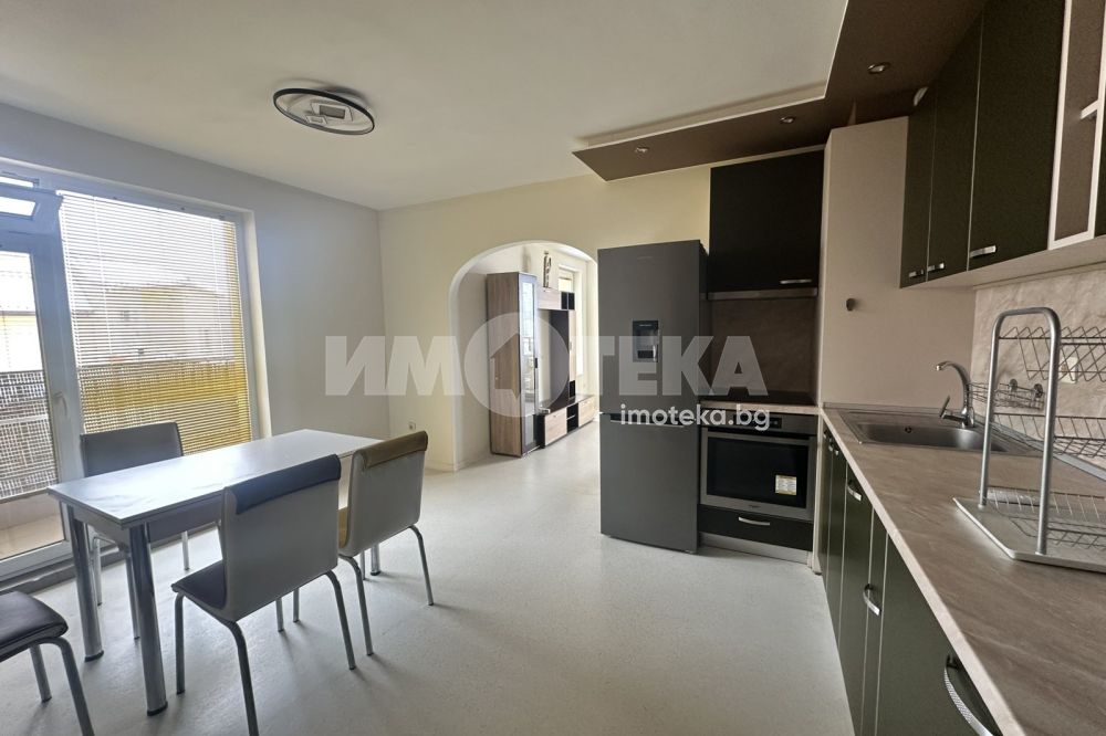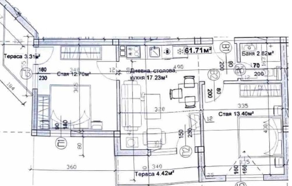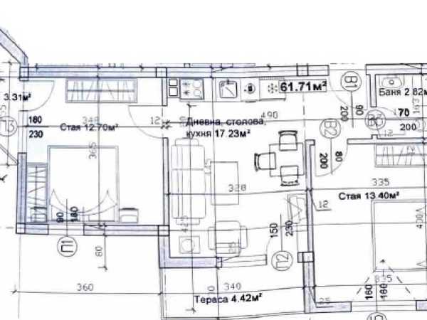 Тристаен апартамент, преустроен на двустаен със застроена площ от 61.71 кв.м., състоящ се от входно антре, дневна, столова, кухня /дневен тракт/, две стаи, баня с тоалетна и две тераси. Имотът се предлага във вида от снимките. Към апартамента има прилежащ таван с площ от 8.33 кв.м.