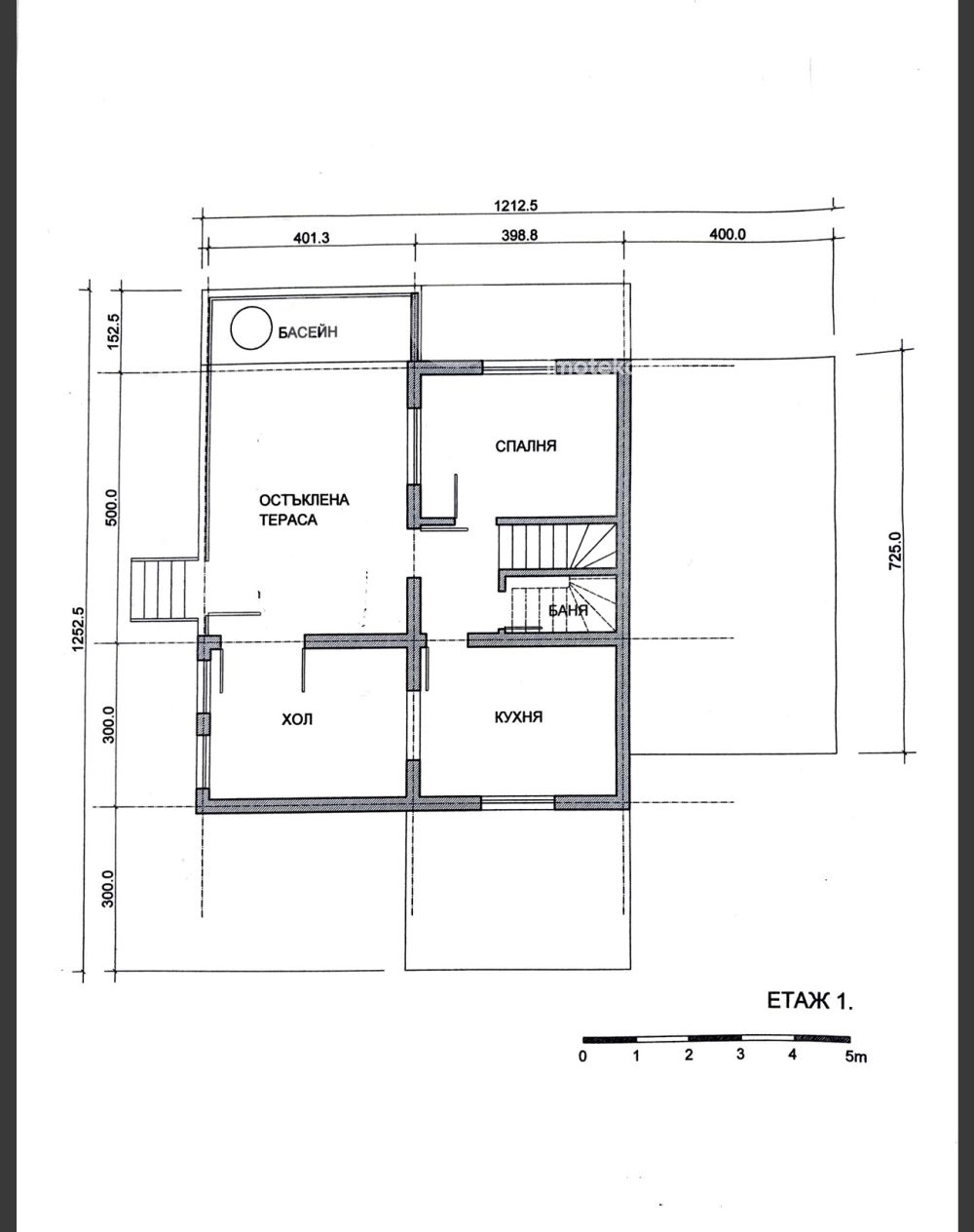 Първи етаж – остъклено входно антре, трапезария с кухненски бокс, спалня;