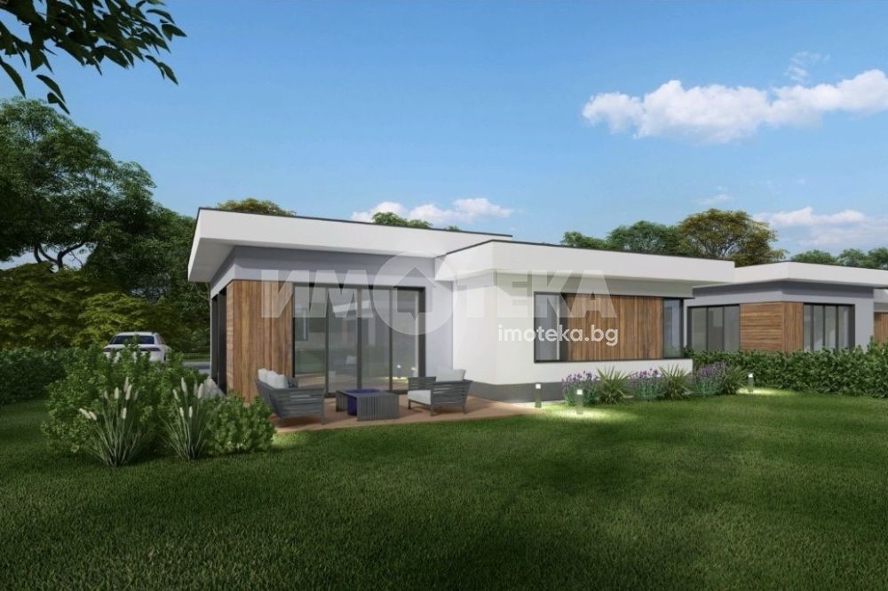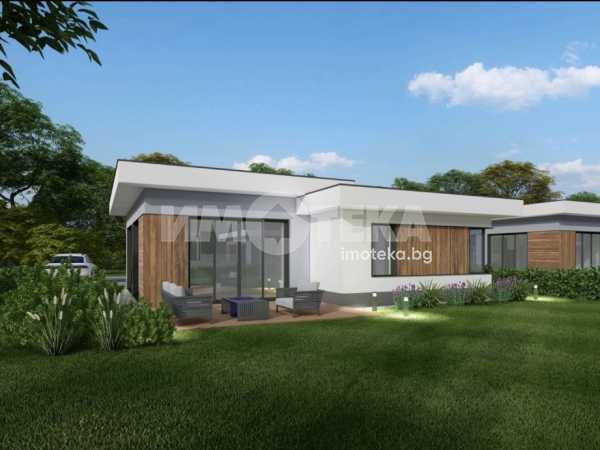 Къщата е с функционално разпределение на едно ниво и включва просторна дневна с кухненски бокс и трапезария, две спални, два санитарни възела (баня с тоалетна), складово/техническо помещение и веранда с излаз към самостоятелен двор.