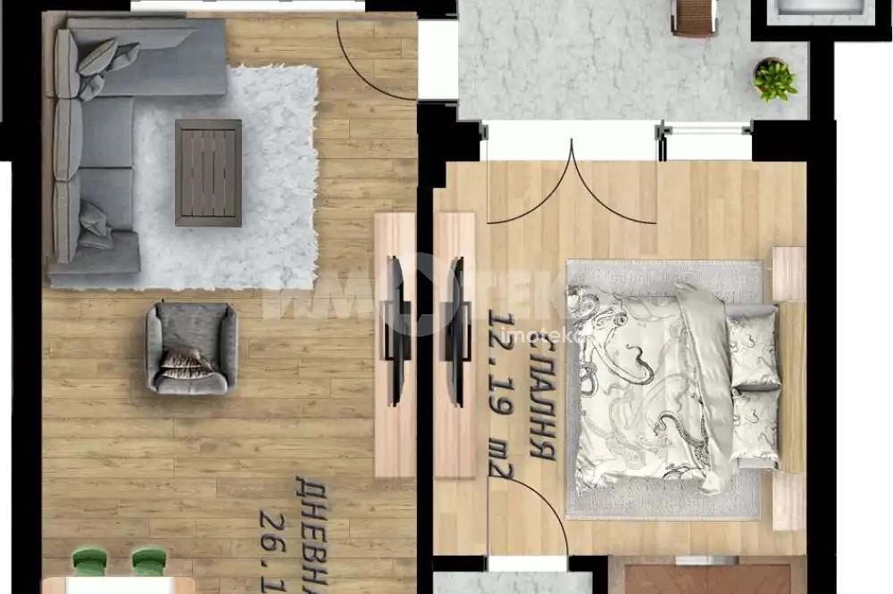 Състои се от входно антре, хол с кухненски бокс, спалня, баня с тоалетна и просторна западна тераса.