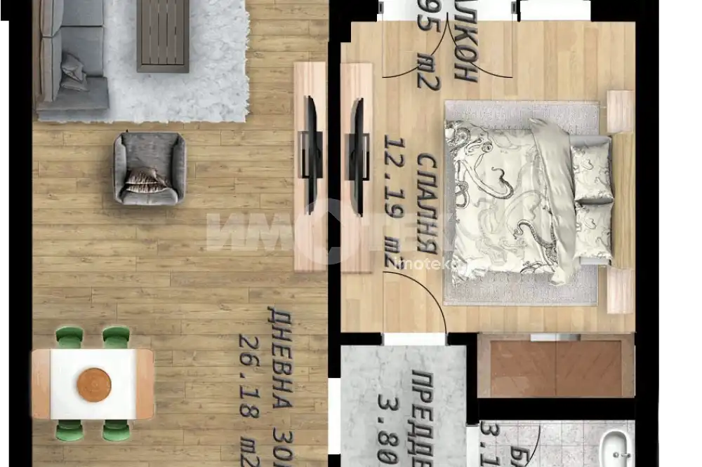 Състои се от входно антре, хол с кухненски бокс, спалня, баня с тоалетна и една западна тераса.