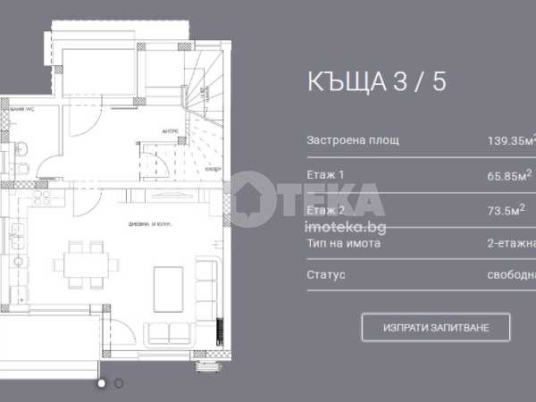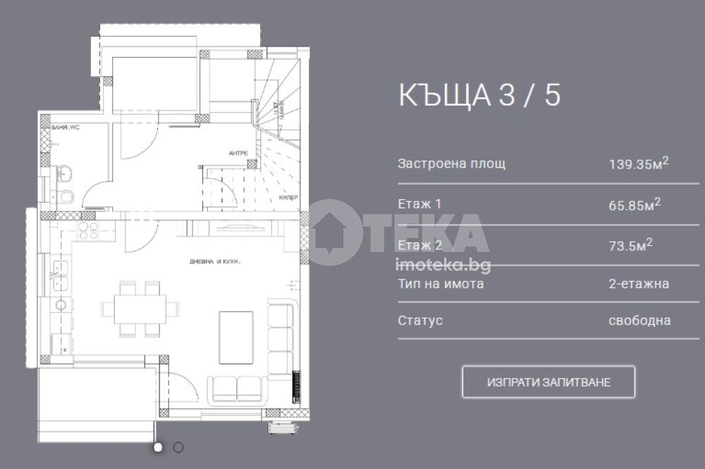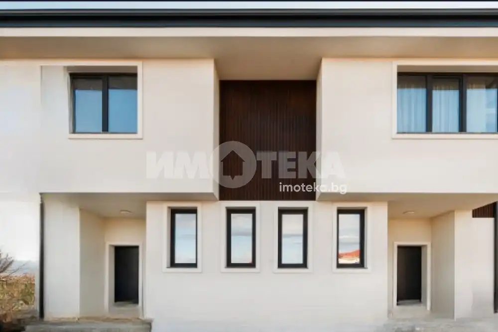 Пространството е практично разпределено като на първия етаж се намират антре, дневна с кухненски бокс, спалня, баня и килер. На втория етаж има три спални, две бани и тераса.