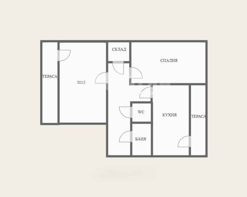 Състои се от: отделна дневна, самостоятелна спалня, гардеробна/склад, кухня, отделно баня и тоалетна, две тераси.