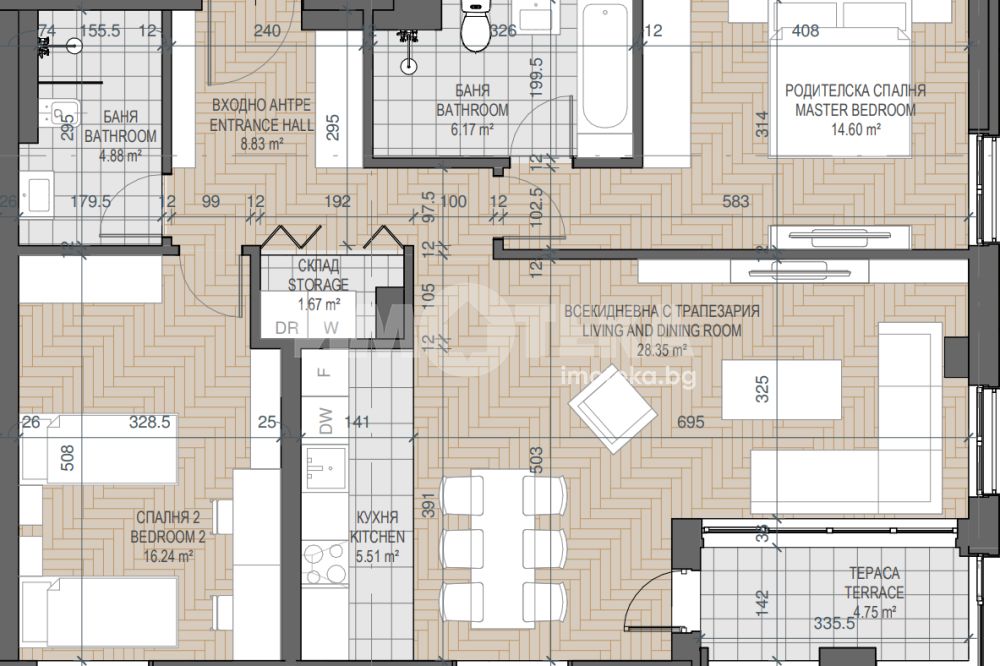 Предлагаме на Вашето внимание тристаен тухлен апартамент, състоящ се от две спални,хол с бокс две бани с тоалетна и тераса..Може да бъде закупено паркомясто на отделна цена.