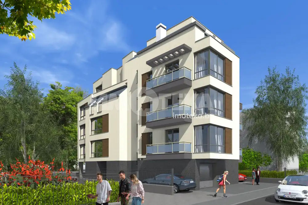 Пет етажна сграда, построена с тухли Винербергер, дограма Рехау и италиански безшумен асансьор.