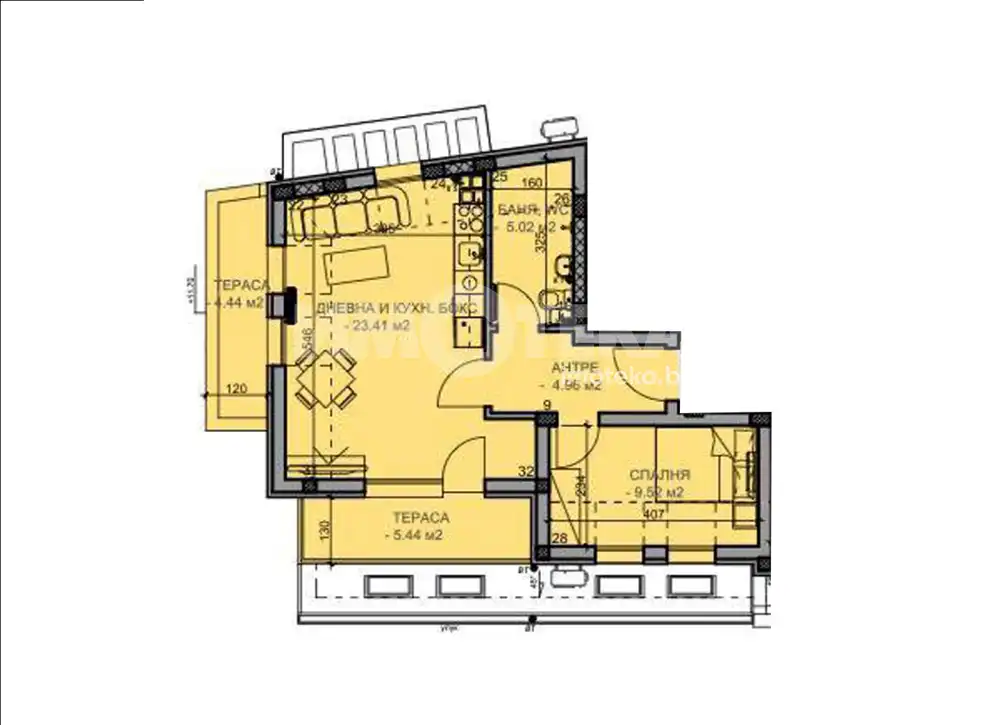 Състой се от преходно антре с достъп до баня с тоалетна, спалня, хол с кухненски бокс и излаз към 2 тераси.