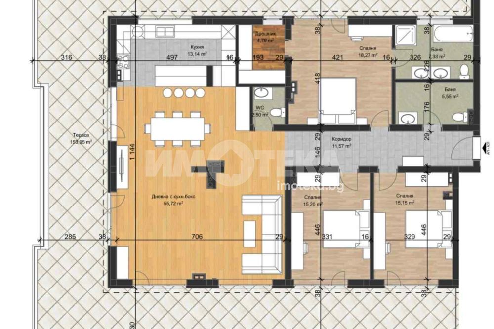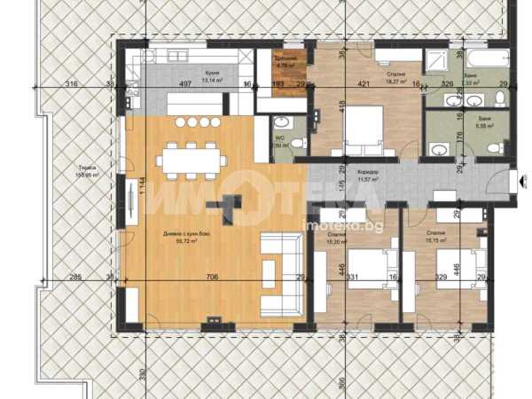 Този многостаен апартамент е разположен в бутикова сграда в строеж в кв. Остромила, отличаваща се с модерен дизайн и висококачествено строителство. Жилището предлага просторна дневна,три широки спални, две бани и голяма тераса,която е 154кв.м с отлична ориентация. Използвани са премиум материали и съвременни технологии, които гарантират дълготраен комфорт и енергийна ефективност. Има възможност апартаментът да бъде довършен по избор на клиента, според личните предпочитания и стил.