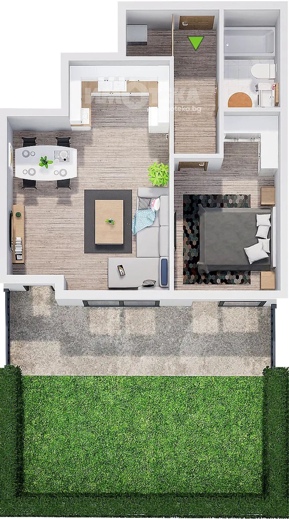 Дворно място:32,71 m² , Жилището се състои от хол с кухненски бокс, спалня , едно санитарно помещение, веранда и дворно място. Към жилището има прилежащо едно паркомясто на цена от 17 000 евро .
