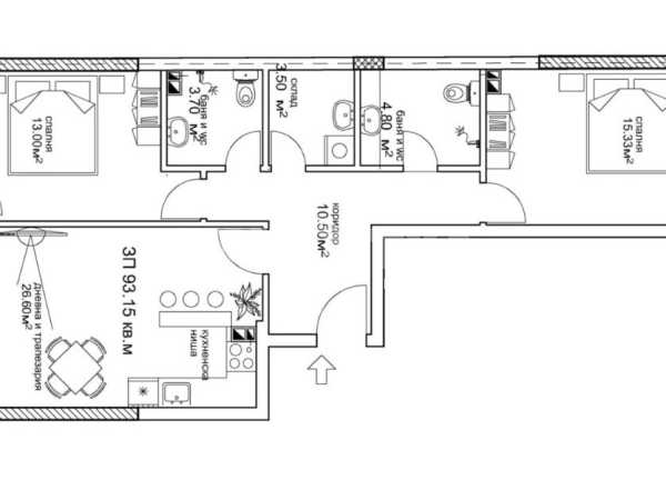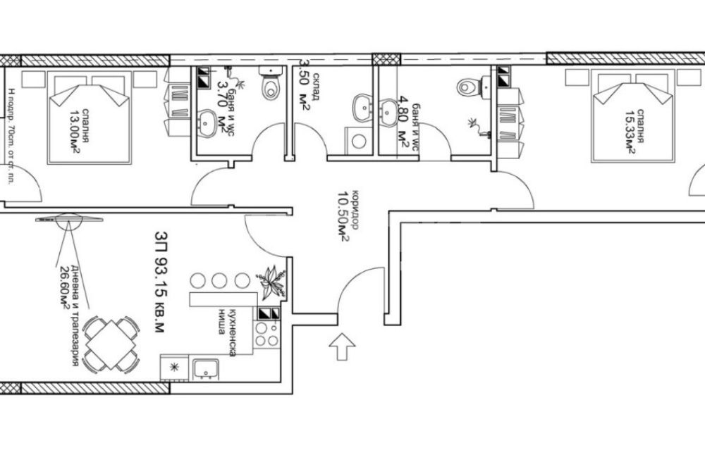 Предлагаме за продажба просторен тристаен апартамент с площ 100 кв.м., със следното разпределение, светла дневна с кухня и трапезария, две самостоятелни спални, две бани , перално помещение със склад и тераса.